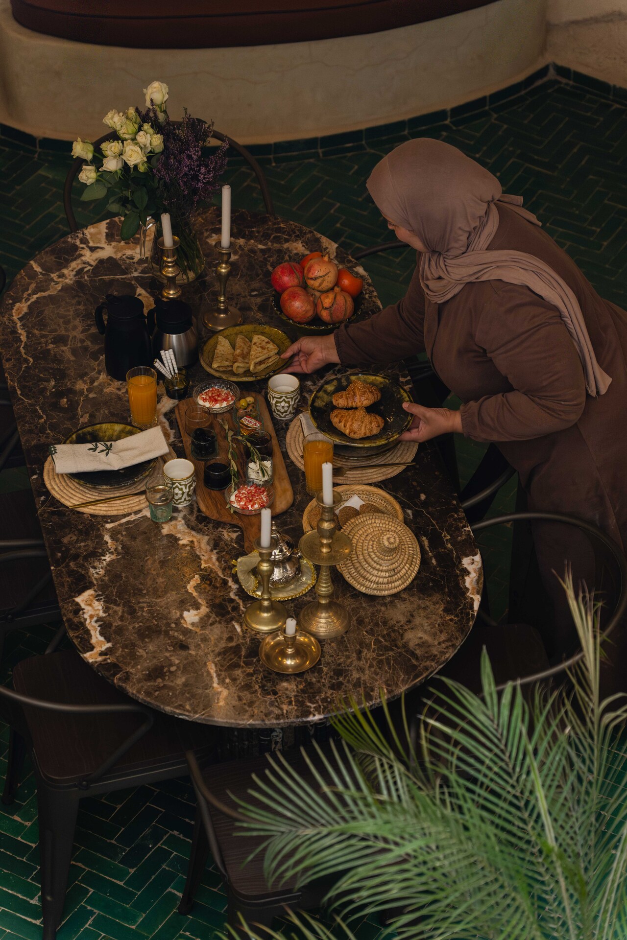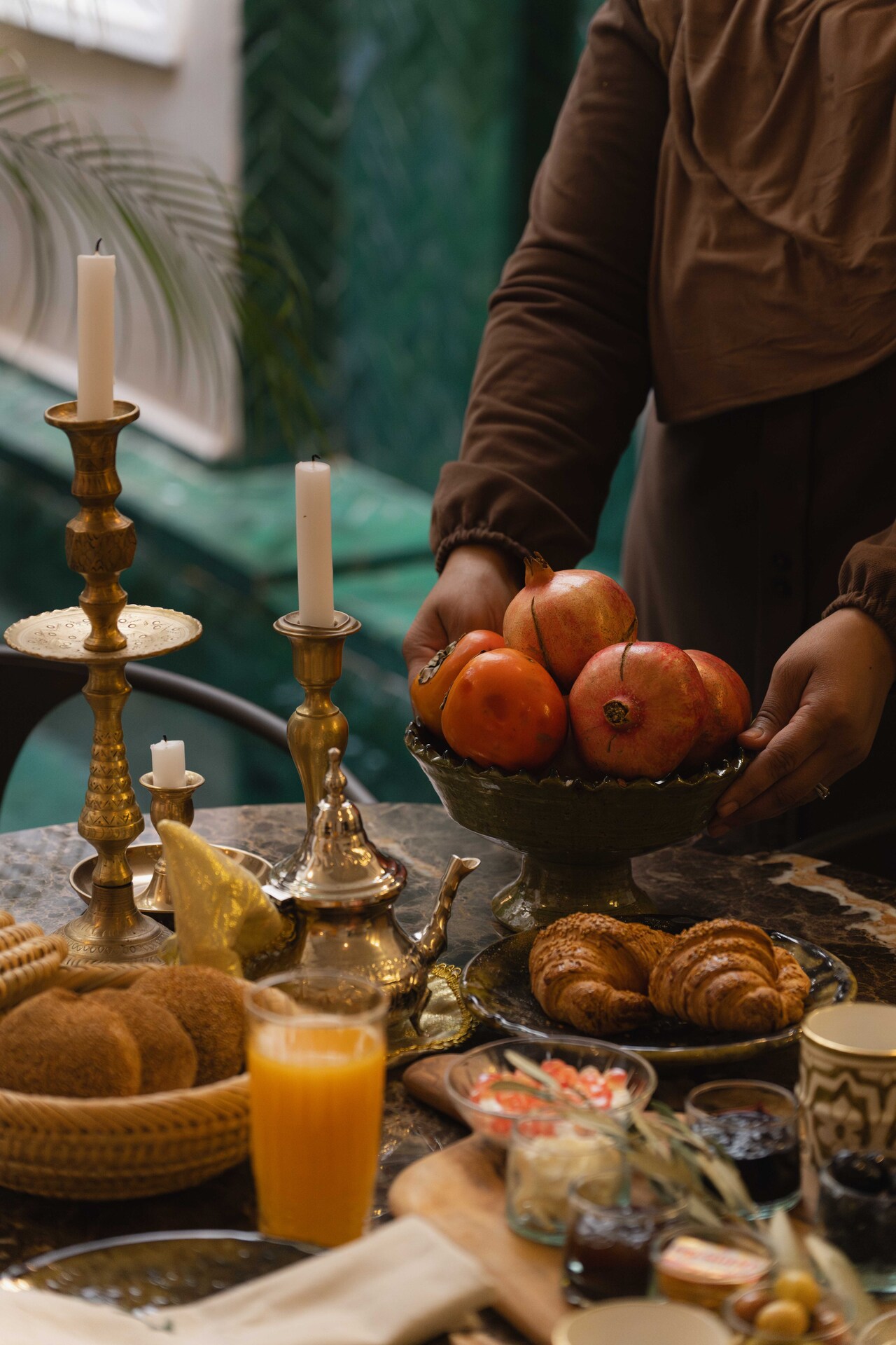 Mornings begin slowly with an abundant homemade breakfast, served in the calm of the courtyard or on the sunlit terrace. Everything is prepared fresh each day, with eggs made to your preference, seasonal fruits, creamy yogurt, and warm, freshly baked pastries. Freshly squeezed orange juice, alongside Arabic coffee or traditional Moroccan mint tea, completes a start to the day that feels both nourishing and indulgent.